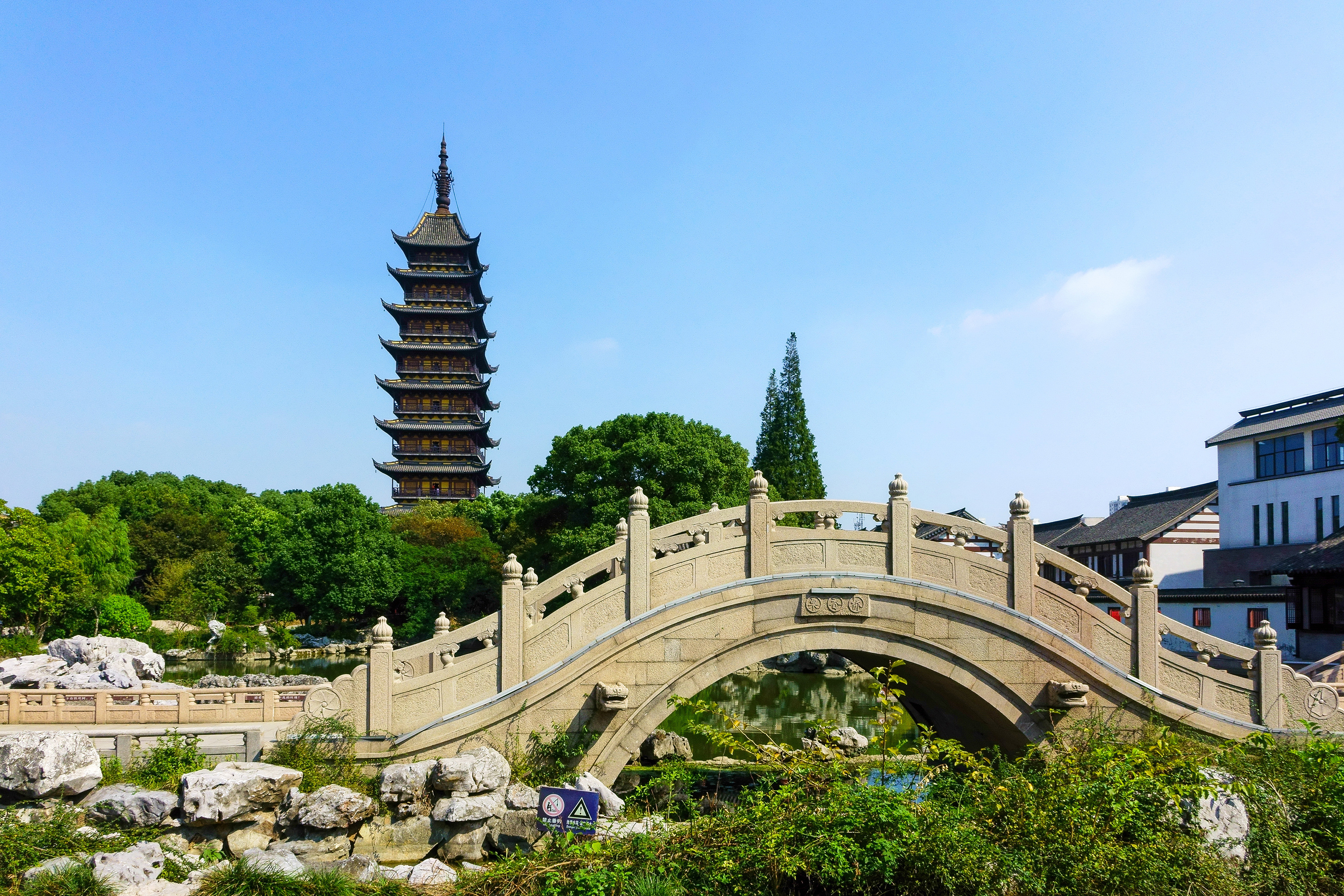 方塔园,是一处在宋代古迹旧址上新建的古典园林,因园中有一方塔而得名,方塔原名为“崇教兴福寺塔”,为常熟的地标之一,历经800多年的风雨沧桑,依旧伟岸挺拔,也是古建筑中的瑰宝。穿梭在古色古香的园林中,亭台楼阁错落有致,移步异景,感受江南风韵。